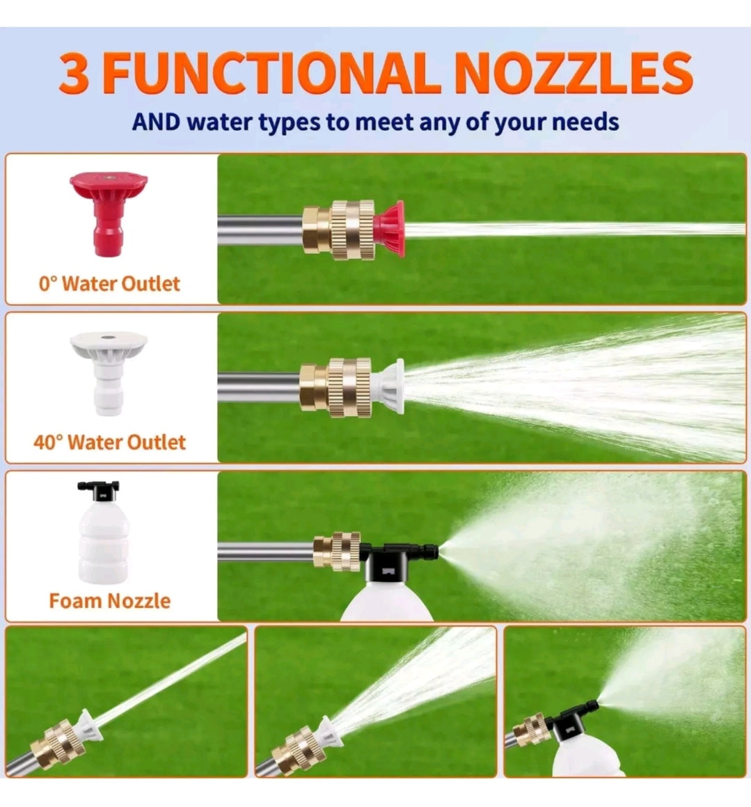 4.2 Verschiedene Düsen für Ihre Verwendung: Effektive Reinigung. Unser batteriebetriebener kabelloser Hochdruckreiniger ist mit 0°, 40° ausgestattet. Die 40°-Auslassdüse versprüht einen Wassernebel, der für die Gartenbewässerung und Pflanzenbewässerung geeignet ist, während die 0°-Auslassdüse eine direkte und leistungsstarke Wassersäule bietet, um hartnäckige Flecken zu entfernen.