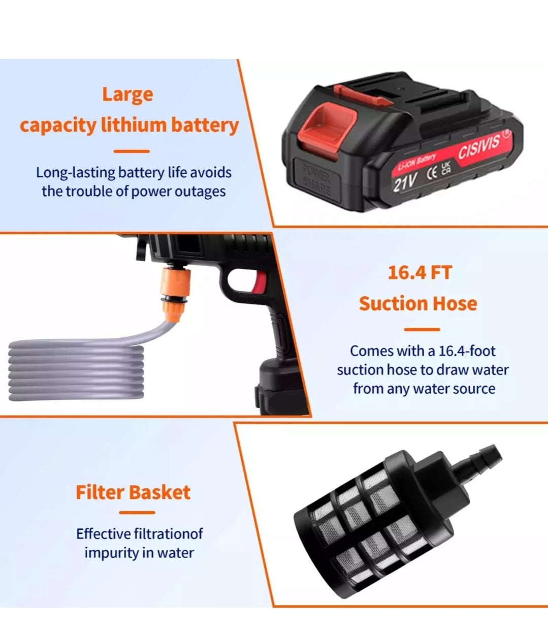 2. Wasser von überall holen: Dieser kabellose Hochdruckreiniger wiegt etwa 2,5 Pfund. Der 16,5 Fuß lange Schlauch mit Filterkorb kann Verunreinigungen, Partikel, Laub oder Schlamm effektiv filtern und unsere Presse besser schützen. Im Vergleich zu anderen Produkten ist unsere batteriebetriebene Presse leichter und tragbarer.
