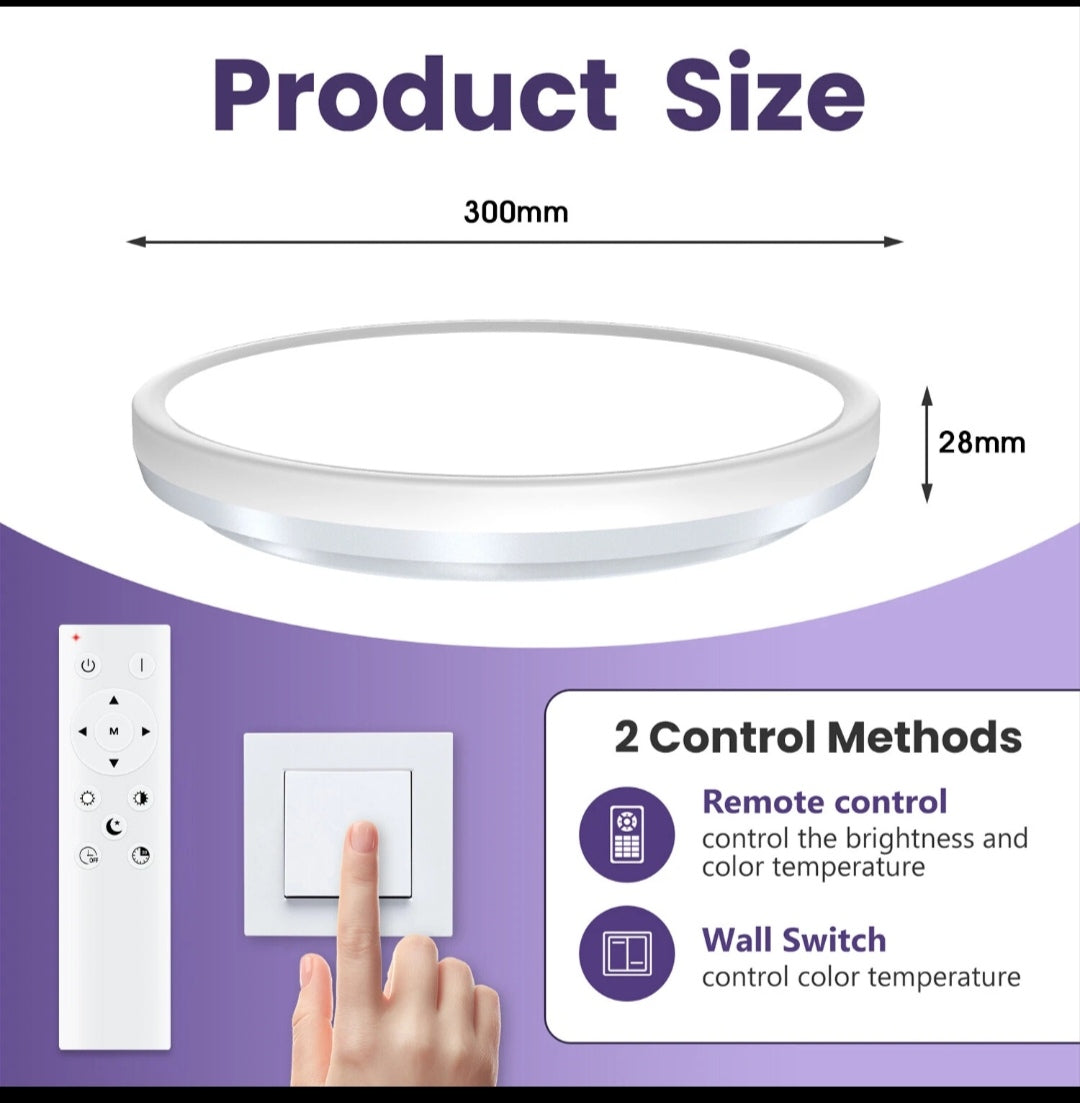 1.LED-Deckenleuchte mit 2,7 cm ultradünnen gekrümmten Rand Design, optisch schlanker. 100% - 5% dimmbar. 3 Farbtemperaturen, die Farbtemperatur der LED-Deckenleuchte kann stufenlos von 3000 K bis 6000 K eingestellt werden und die Helligkeit kann von 5% bis 100% geregelt werden.