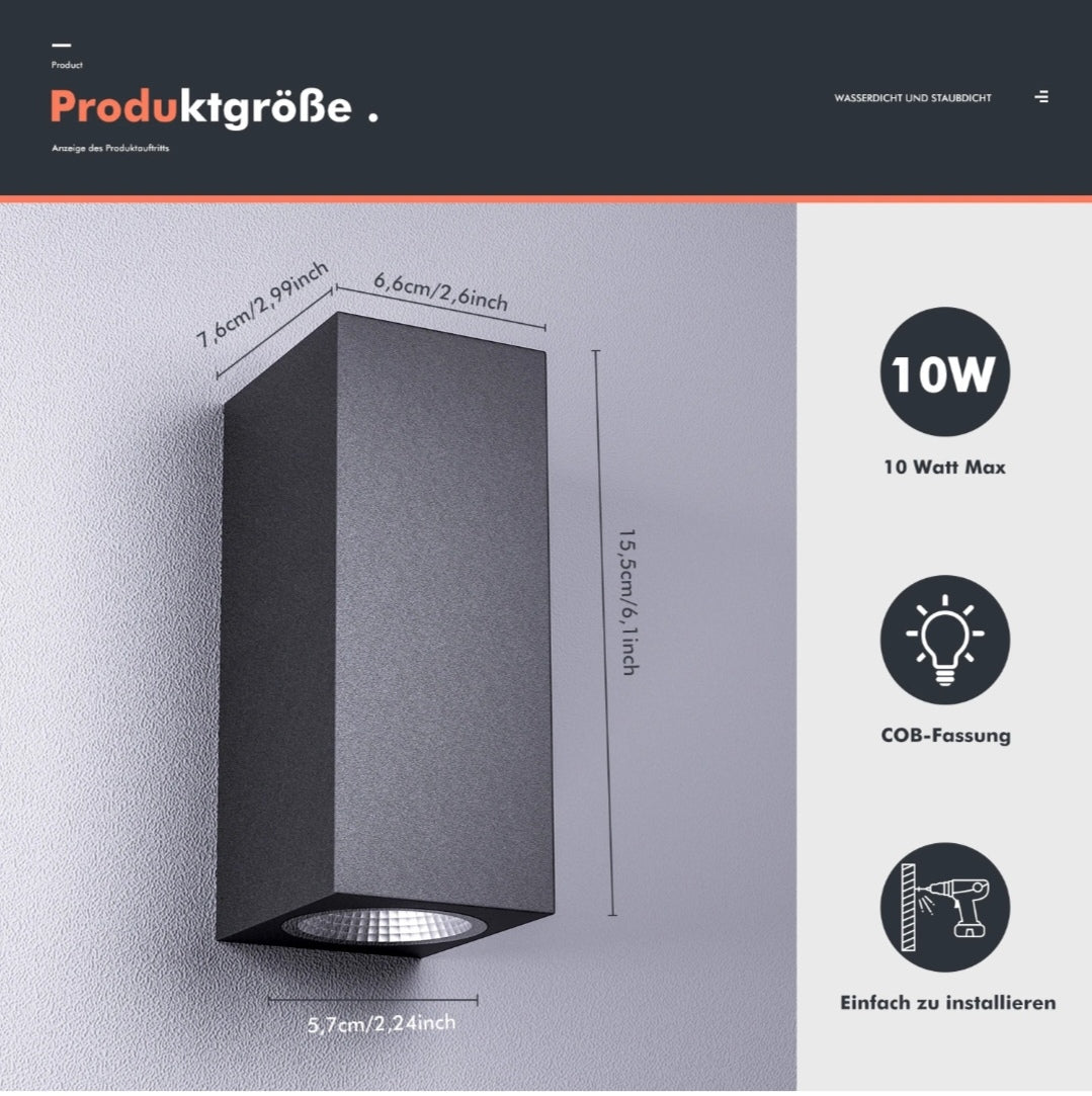 Die schwarze Außenleuchte passt an jede Innen- und Außenwand und ist mit wenigen Handgriffen montiert. Die Wandleuchte verfügt über zwei GU10 Leuchtmittel, die ein schönes Licht an die Hauswand wirft. Der Außenwandstrahler ist aus Metall gefertigt und ist somit ideal für den Innen- und Außenbereich geeignet. Durch die Schutzklasse IP44 ist es kein Problem, wenn die Wandleuchte mit Spritzwasser in Berührung kommt!